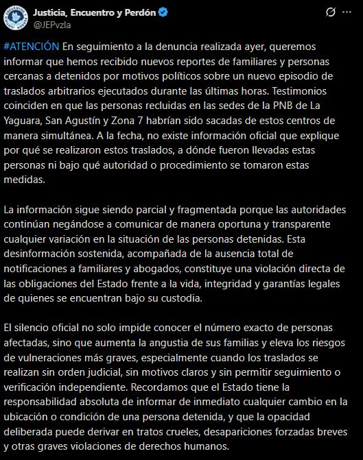 La ONG Justicia, Encuentro y Perdón (JEP) alertó este martes sobre un nuevo episodio de traslados arbitrarios de presos políticos en Venezuela, cuyo paradero sigue sin ser informado a familiares ni abogados.
