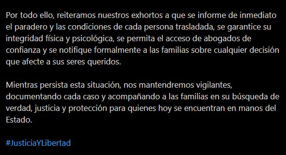 La ONG exigió a las autoridades informar de inmediato sobre el paradero y las condiciones de cada una de las personas trasladadas, garantizar su integridad física y psicológica, permitir el acceso de abogados de confianza y notificar formalmente a los familiares.