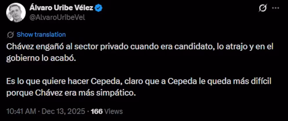 Álvaro Uribe, expresidente de Colombia, realizó una comparación entre el senador Iván Cepeda y el fallecido venezolano Hugo Chávez en una publicación en X (antes Twitter) el 13 de diciembre de 2025 a las 10:43 a. m. En esta sugirió que Cepeda buscaría replicar la estrategia del exdictador respecto al sector privado.