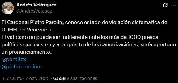 A través de su cuenta de X, Velásquez indicó que el Vaticano «no puede ser indiferente» ante los presos políticos, que son 838 según la ONG Foro Penal, la mayoría detenidos en el contexto poselectoral tras el fraude de Nicolás Maduro el 28 de julio de 2024.