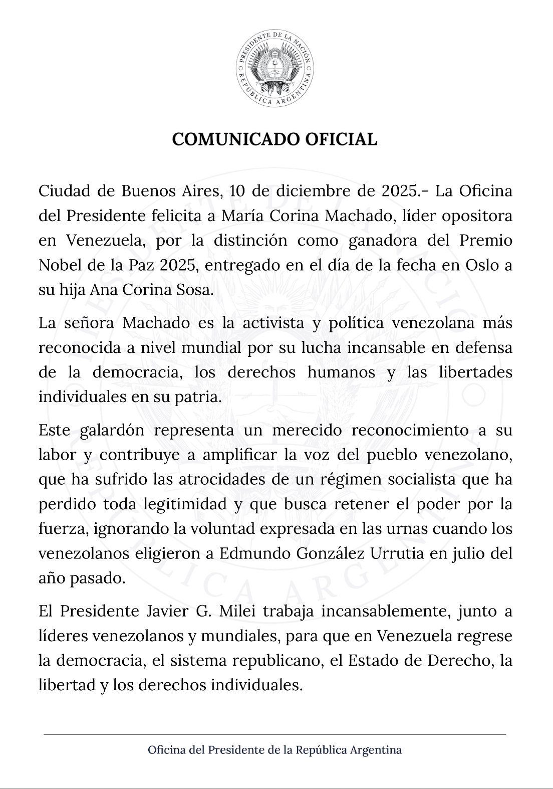 La Oficina del Presidente de la República Argentina emitió la tarde de este miércoles 10 de diciembre, un comunicado oficial en el que felicita a la líder opositora venezolana, María Corina Machado, tras ser distinguida con el Premio Nobel de la Paz 2025.
