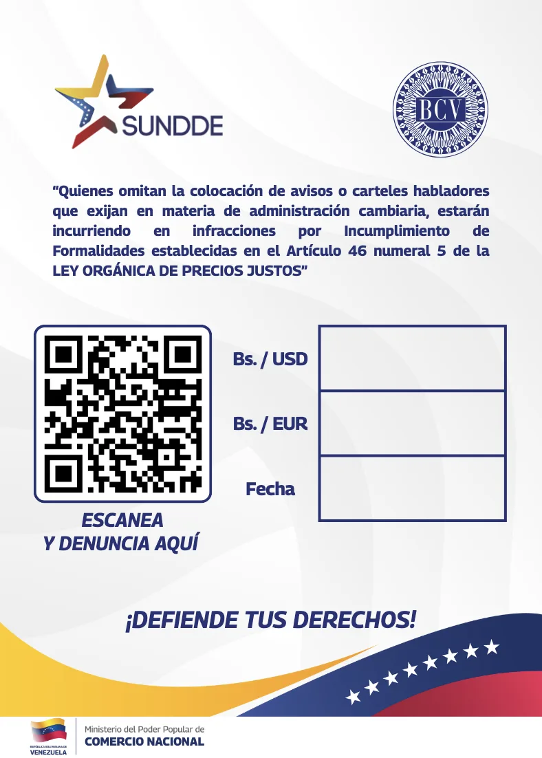 La Superintendencia Nacional para la Defensa para los Derechos Socioeconómicos (Sundde) estableció un nuevo formato de carácter obligatorio para la exhibición de las tasas de cambio del dólar y el euro en los establecimientos comerciales del país.