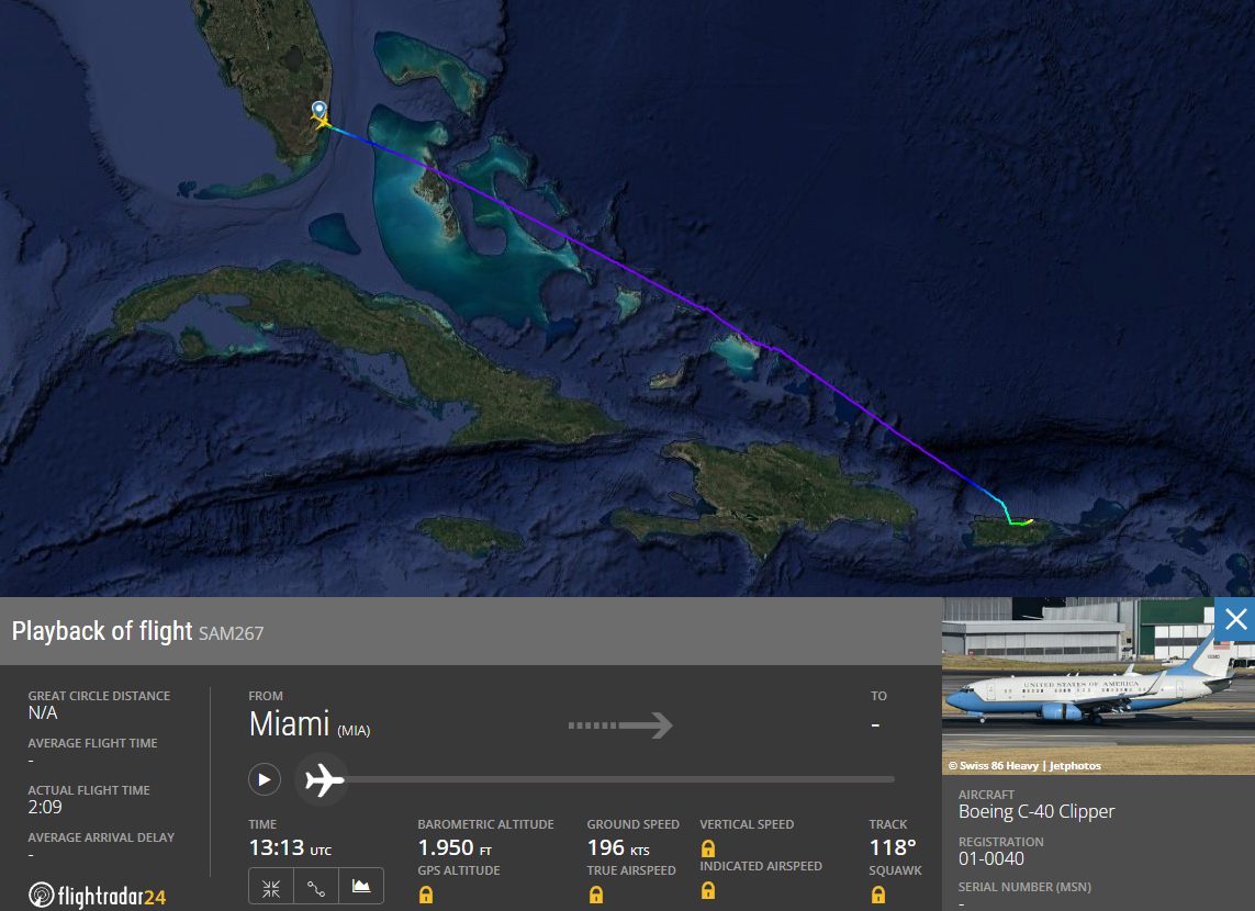 Según datos del monitor de tráfico aéreo FlightRadar24, el vuelo con código de llamada 01-0040 llegó al Aeropuerto Internacional Luis Muñoz Marín durante el mediodía. Presumiblemente, la aeronave despegó desde el Aeropuerto Internacional de Miami.