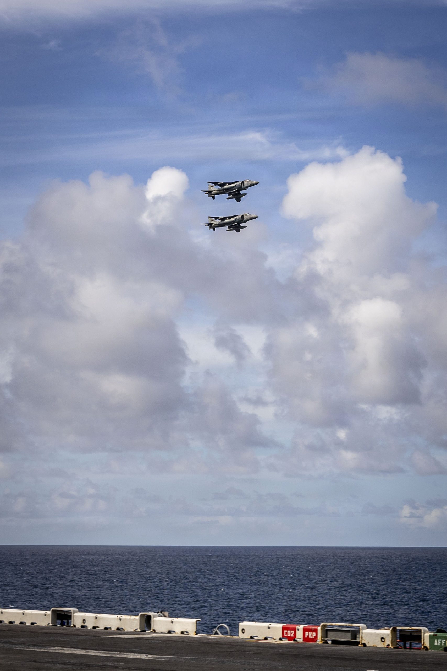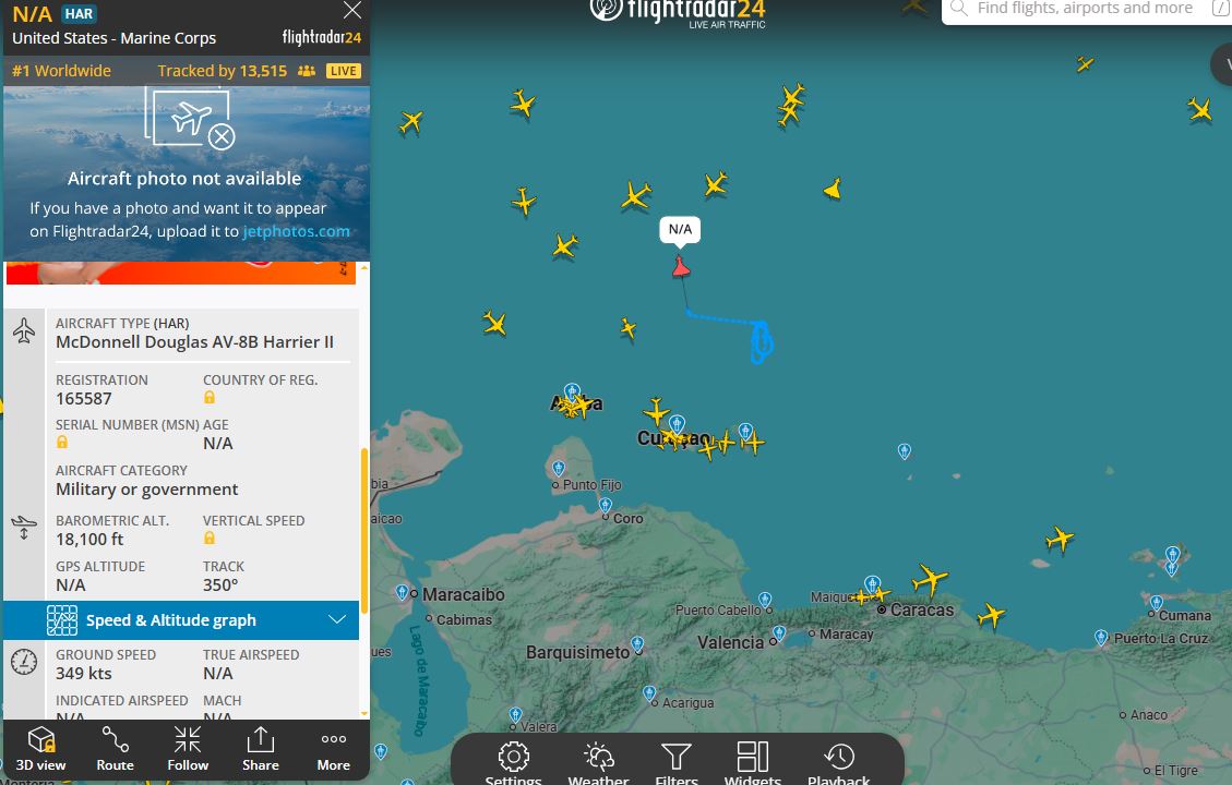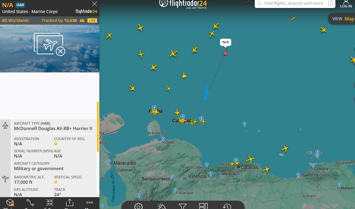 Por primera vez, dos aviones de ataque McDonnell Douglas AV-8B Harrier II del Cuerpo de Marines de Estados Unidos (USMC) han sido visibles y rastreados públicamente en la plataforma Flightradar24, mientras realizaban operaciones aéreas a muy corta distancia de las costas venezolanas, específicamente en el área del Mar Caribe frente a Maracaibo, Valencia y Caracas.