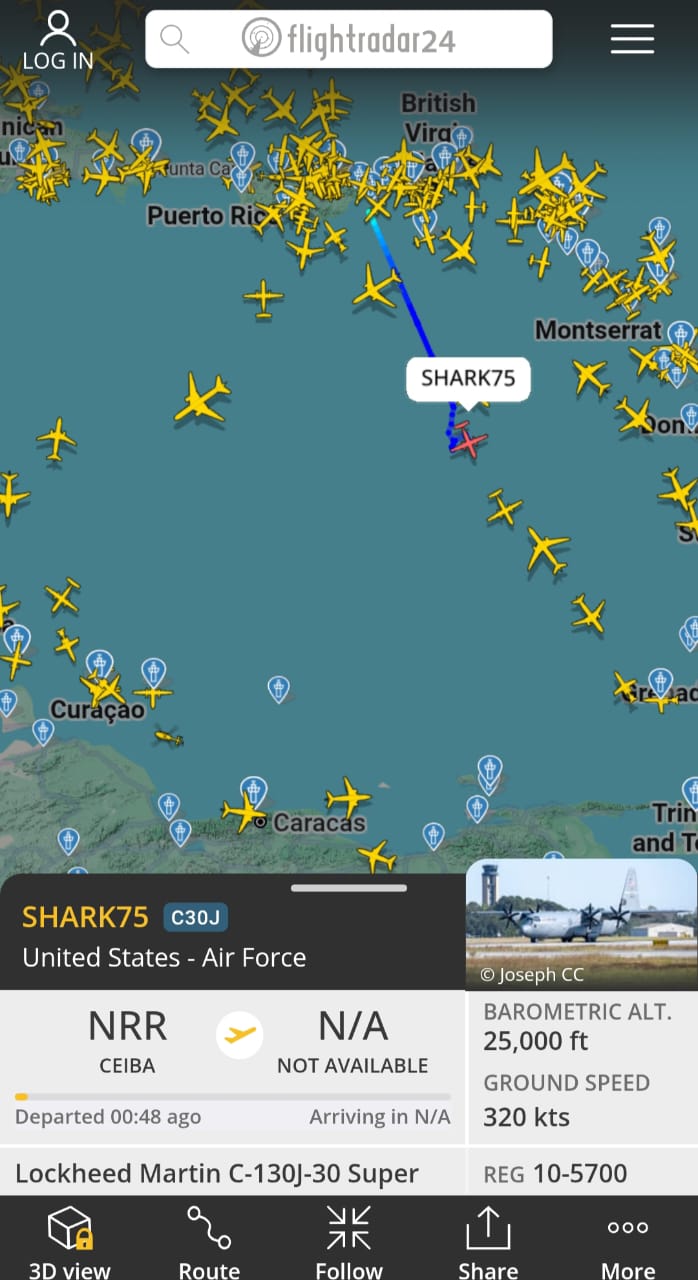 Por su parte, el LM-100J Hercules fue detectado en una trayectoria similar, con origen probable en el área de Fort Lauderdale, Florida (posiblemente desde instalaciones logísticas o bases cercanas en el continente).