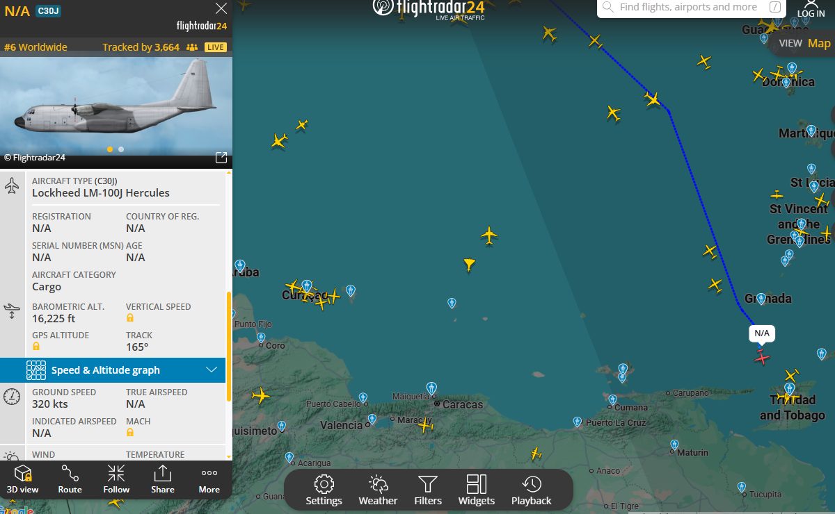 Al menos dos aeronaves militares Lockheed C-130 Hércules de la Fuerza Aérea estadounidense fueron rastreadas este martes 16 de diciembre aproximándose a Trinidad y Tobago, según datos en vivo de Flightradar24.