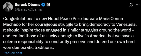 A través de su cuenta en la red social X, Obama expresó su admiración por el trabajo de la nueva laureada. «Felicitaciones a la nueva laureada con el Premio Nobel de la Paz, María Corina Machado, por su valiente lucha para llevar la democracia a Venezuela», escribió.