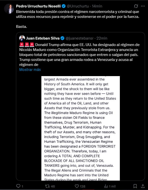 A través de su cuenta oficial en la red social X (antes Twitter), Urruchurtu expresó: “Bienvenida toda presión contra el régimen narcoterrorista y criminal que utiliza esos recursos para reprimir y sostenerse en el poder por la fuerza. Basta.” El mensaje fue publicado minutos después de que se difundiera el anuncio del mandatario estadounidense.