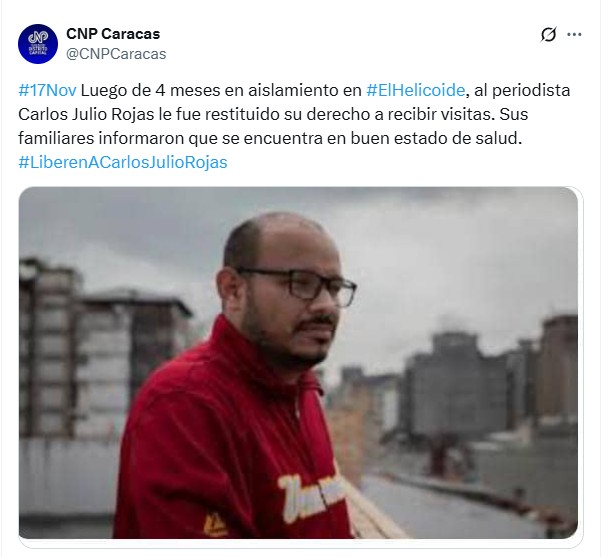 En una publicación en X, la sección de Caracas del CNP dijo que a Rojas «le fue restituido su derecho a recibir visitas».