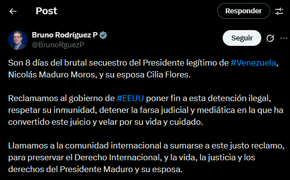 El canciller del régimen de Cuba, Bruno Rodríguez, protagonizó una nueva arremetida diplomática contra el Gobierno de Estados Unidos, al exigir la liberación de Nicolás Maduro y su esposa, Cilia Flores, a ocho días de lo que calificó como un “brutal secuestro”, durante un operativo militar estadounidense ejecutado la madrugada del sábado 3 de enero en Caracas.