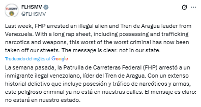 El Departamento de Seguridad Vial y Vehículos Motorizados de Florida anunció la detención de un presunto líder de la banda criminal «Tren de Aragua».