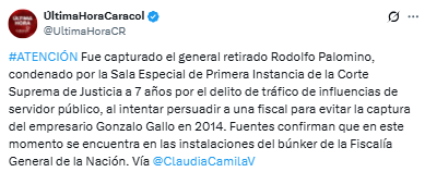 Las autoridades colombianas confirmaron la captura del general (r) Rodolfo Palomino, exdirector de la Policía Nacional, quien fue condenado recientemente por la Sala Especial de Primera Instancia de la Corte Suprema de Justicia.