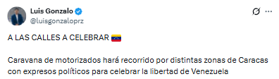 El periodista Luis Gonzalo Pérez informó a través de su cuenta en X que una caravana de motorizados recorrería distintas zonas de la ciudad para acompañar a los líderes y activistas que acaban de recuperar su libertad.