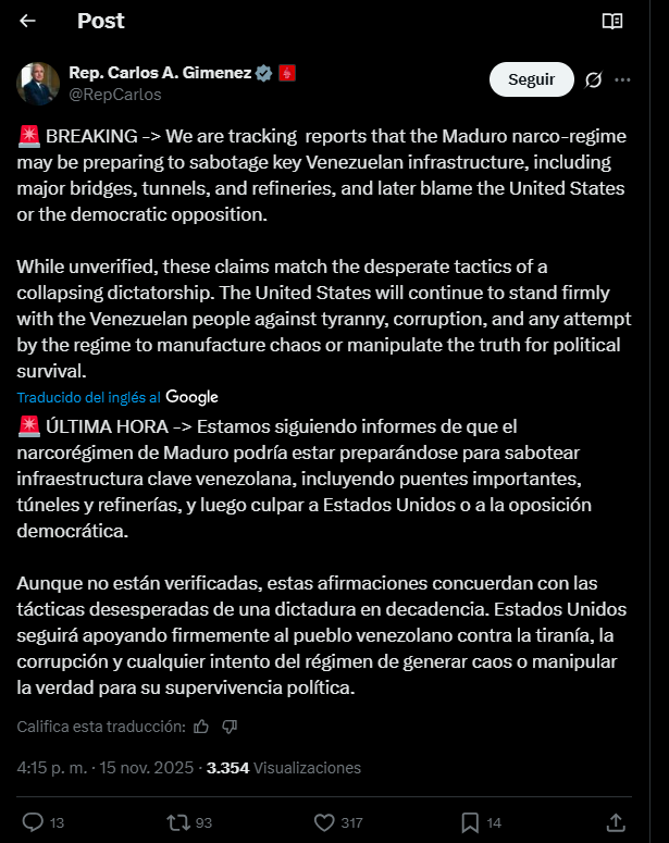 El congresista republicano de origen cubano Carlos Giménez lanzó este sábado 15 de noviembre, una grave advertencia sobre presuntos planes del régimen de Nicolás Maduro para ejecutar actos de sabotaje contra infraestructura estratégica en Venezuela y luego responsabilizar a Estados Unidos o a la oposición democrática.