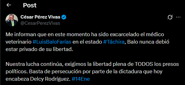 El exgobernador del estado Táchira, César Pérez Vivas, informó sobre la excarcelación del médico veterinario Luis Balo Farías, quien se encontraba privado de libertad en esa entidad andina.