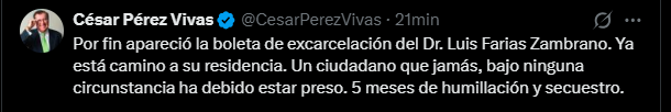 “Por fin apareció la boleta de excarcelación del Dr. Luis Farías Zambrano. Ya está camino a su residencia. Un ciudadano que jamás, bajo ninguna circunstancia, ha debido estar preso. Cinco meses de humillación y secuestro”, denunció Pérez Vivas.