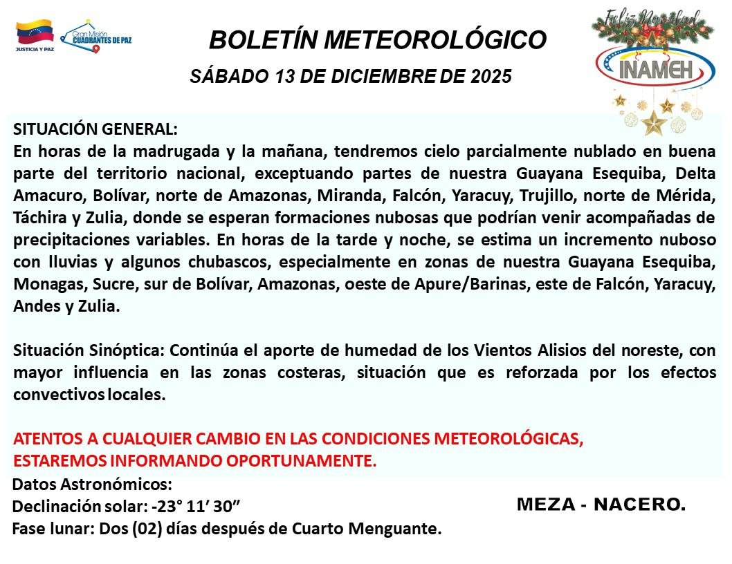 Venezuela amaneció este sábado 13 de diciembre con cielo parcialmente nublado en gran parte de su territorio, de acuerdo con el más reciente reporte del Instituto Nacional de Meteorología e Hidrología (Inameh).