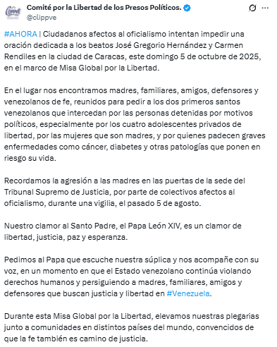 Madres, familiares, amigos, defensores y venezolanos de fe se reunieron para elevar una plegaria a los dos primeros santos venezolanos (próximos a ser canonizados el 19 de octubre de 2025) pidiendo su intercesión por las personas detenidas por motivos políticos. El clamor se centró especialmente en cuatro adolescentes privados de libertad, en las mujeres que son madres encarceladas, y en aquellos presos que sufren graves enfermedades.