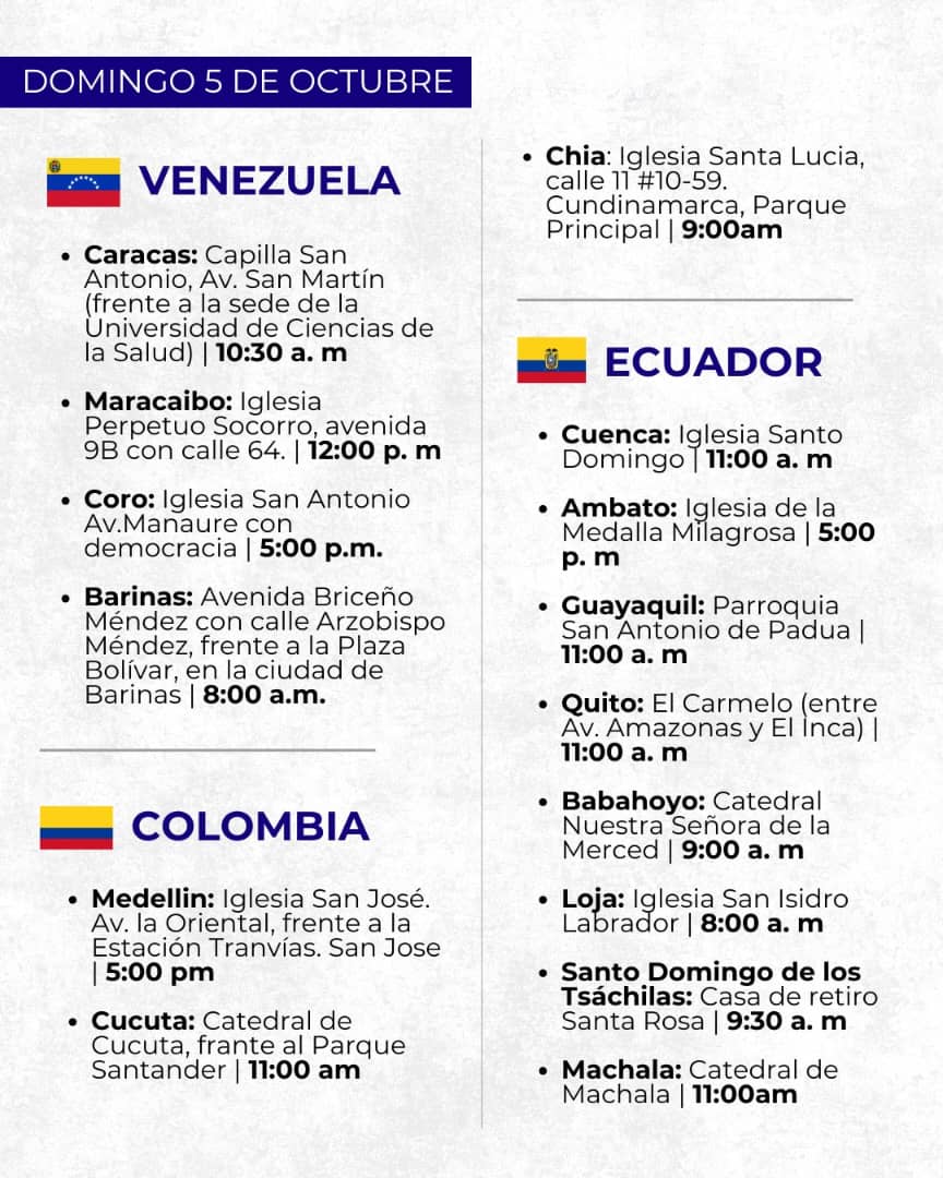 En Caracas, la misa principal se llevará a cabo a las 10:30 a.m. en la Capilla San Antonio, ubicada en la Av. San Martín, frente a la sede de la Universidad de Ciencias de la Salud.