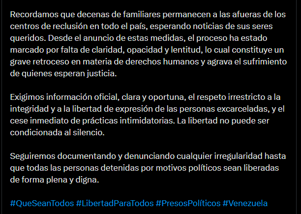 La organización recuerda que la libertad no puede estar condicionada al silencio y que seguirá documentando y denunciando cualquier irregularidad hasta que todas las personas detenidas por motivos políticos en Venezuela sean liberadas de manera plena, digna y respetuosa de sus derechos fundamentales.