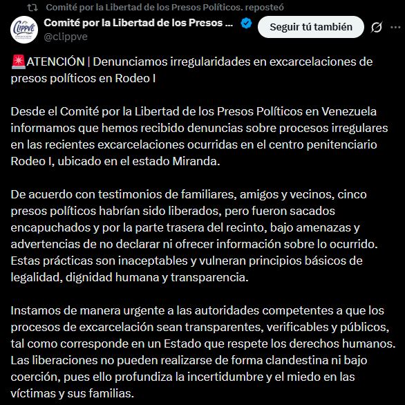 El Comité por la Libertad de los Presos Políticos en Venezuela (Clippve) publicó este sábado 10 de enero en su cuenta oficial de X, una denuncia urgente sobre irregularidades en los procesos de excarcelación de presos políticos en el centro penitenciario Rodeo I, ubicado en el estado Miranda.
