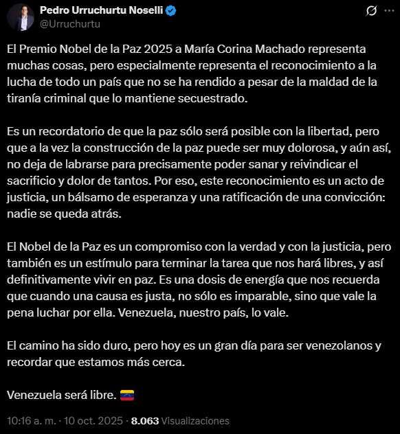 Pedro Urruchurtu: «Representa muchas cosas, pero especialmente representa el reconocimiento a la lucha de todo un país que no se ha rendido a pesar de la maldad de la tiranía criminal que lo mantiene secuestrado».