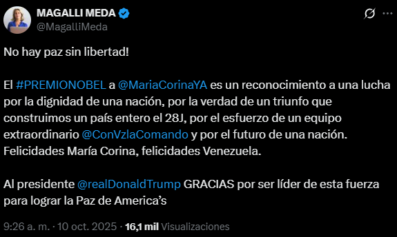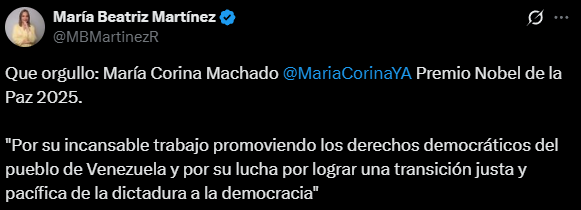 María Beatriz Martínez: «Qué orgullo: María Corina Machado, Premio Nobel de la Paz 2025″.