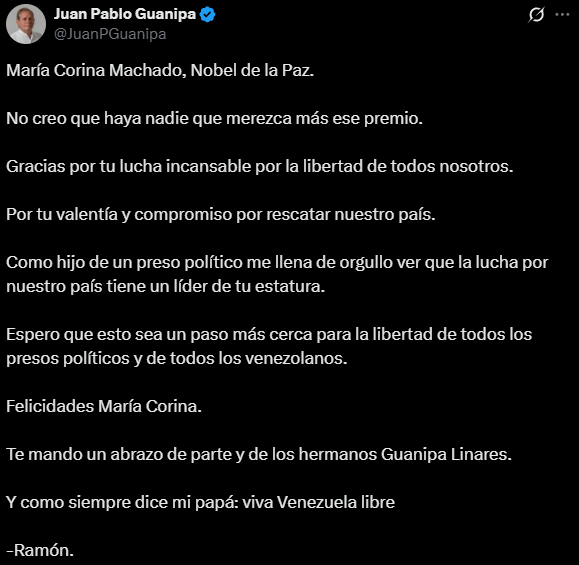 Son muchos a quienes también les encantaría felicitar a María Corina Machado y a todo el pueblo venezolano, pero lamentablemente siguen presos por razones políticas en los calabozos de Nicolás Maduro.