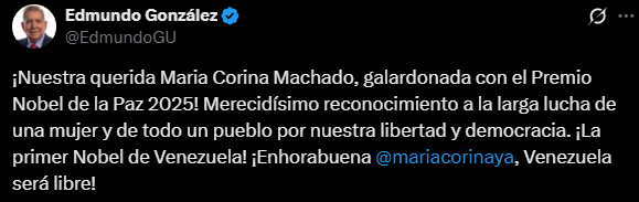 Edmundo González: «Merecidísimo reconocimiento a la larga lucha de una mujer y de todo un pueblo por nuestra libertad y democracia».