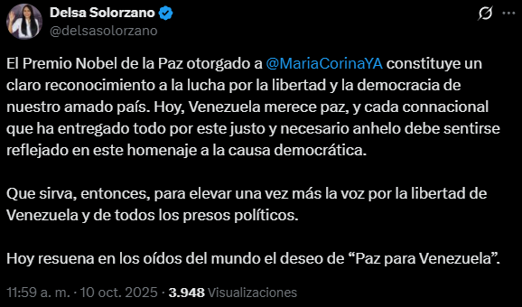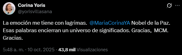 Corina Yoris: «La emoción me tiene con lágrimas. Nobel de la Paz. Esas palabras encierran un universo de significados. Gracias, María Corina».