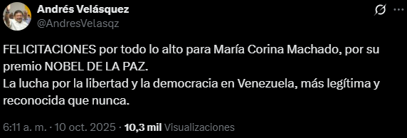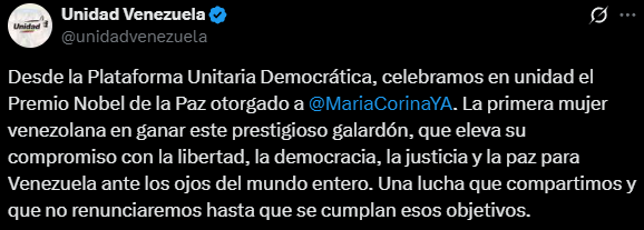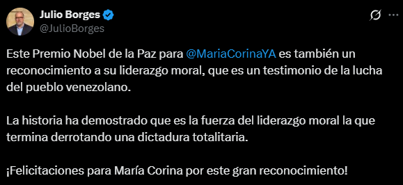 Múltiples colaboradores, aliados y amigos felicitaron este viernes a la líder venezolana, María Corina Machado, por hacer historia al ganar el Premio Nobel de la Paz del año 2025.