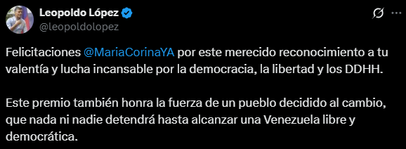 Leopoldo López: «Este premio también honra la fuerza de un pueblo decidido al cambio, que nada ni nadie detendrá hasta alcanzar una Venezuela libre y democrática».