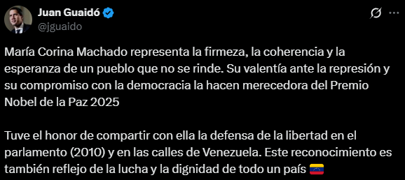 Juan Guaidó: «María Corina Machado representa la firmeza, la coherencia y la esperanza de un pueblo que no se rinde».