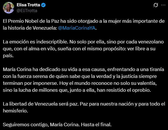 Elisa Trotta: «El Premio Nobel de la Paz ha sido otorgado a la mujer más importante de la historia de Venezuela».