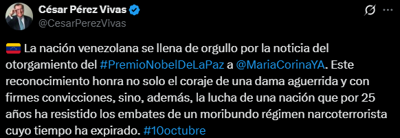 César Pérez Vivas: «Este reconocimiento honra no solo el coraje de una dama aguerrida y con firmes convicciones, sino, además, la lucha de una nación que por 25 años ha resistido los embates de un moribundo régimen narcoterrorista cuyo tiempo ha expirado».