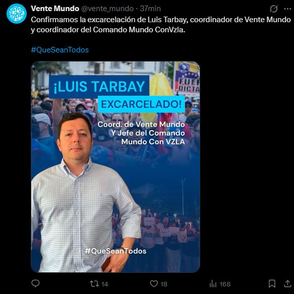«Confirmamos la excarcelación de Luis Tarbay, coordinador de Vente Mundo y coordinador del Comando Mundo ConVzla. #QueSeanTodos», dictaba el mensaje publicado por la cuenta oficial @vente_mundo.