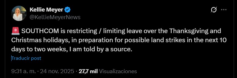 Según una fuente citada por Meyer, la medida se toma “en preparación para posibles acciones o huelgas terrestres en los próximos 10 días a dos semanas”, lo que evidencia un nivel de alerta más alto de lo habitual dentro de las fuerzas estadounidenses desplegadas en el hemisferio.