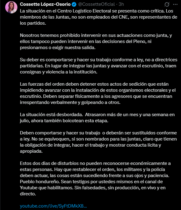 Ante la gravedad de la situación, la consejera electoral hizo un llamado directo al pueblo hondureño para que sea testigo de lo que ocurre dentro del Centro Logístico Electoral.