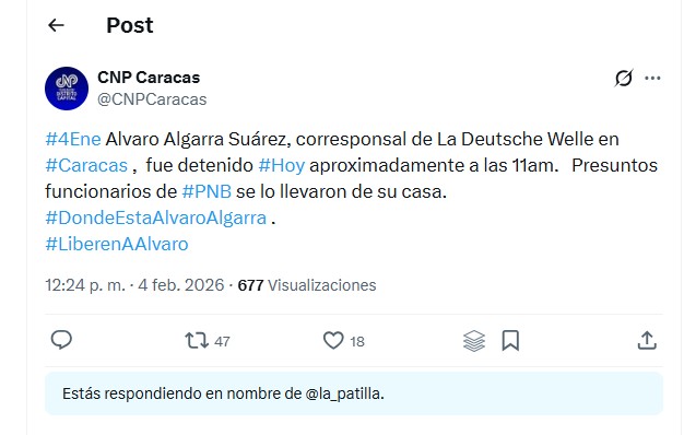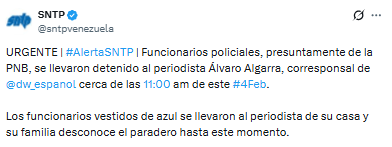 El Colegio Nacional de Periodistas (CNP) denunció a través de su cuenta en X la detención del periodista Álvaro Algarra Suárez, corresponsal de la cadena internacional alemana Deutsche Welle (DW) en Caracas.