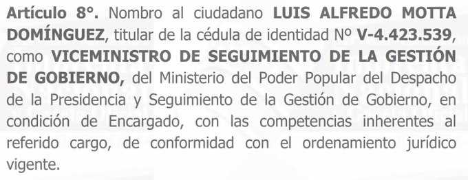 Luis Alfredo Motta Domínguez regresa formalmente a la estructura del régimen chavista tras ser designado como viceministro de Seguimiento a la Gestión de Gobierno. La nueva función del exministro de Energía Eléctrica está enmarcada en la reorganización del Ministerio del Despacho de la Presidencia, instancia que ha centralizado facultades de supervisión estatal tras la publicación del Decreto N° 5.246 de la Gaceta Oficial Extraordinaria N°6.984 el pasado 9 de febrero.