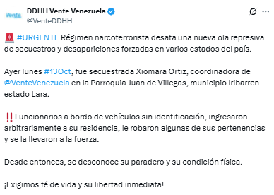 Según la denuncia, el pasado lunes 13 de octubre fue secuestrada Xiomara Ortiz, coordinadora de Vente Venezuela en la Parroquia Juan de Villegas, municipio Iribarren.