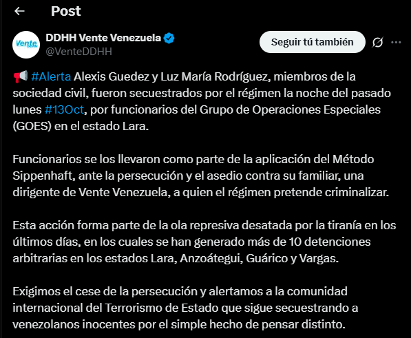 El Comité de Derechos Humanos del partido Vente Venezuela denunció la tarde de este jueves 16 de octubre, el secuestro de dos miembros de la sociedad civil, identificados como Alexis Guédez y Luz María Rodríguez, a manos de funcionarios del Grupo de Operaciones Especiales (Goes) en el estado Lara.