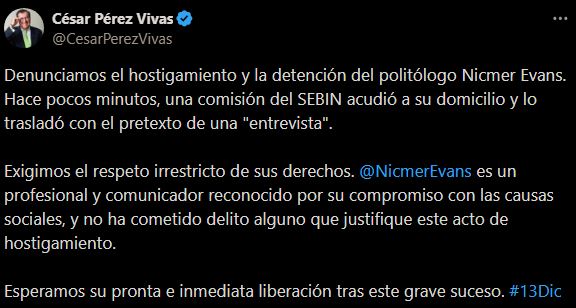 El dirigente político y exgobernador del estado Táchira, César Pérez Vivas, denunció este sábado el hostigamiento y la detención del periodista Nicmer Evans, luego de que funcionarios del Servicio Bolivariano de Inteligencia Nacional (Sebin) acudieran a su residencia en Caracas.
