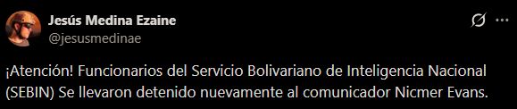 Por su parte, el reportero gráfico Jesús Medina compartió un video en su cuenta de X, en el que se observa cómo los funcionarios del Sebin se llevaron detenido a Evans en una camioneta negra.