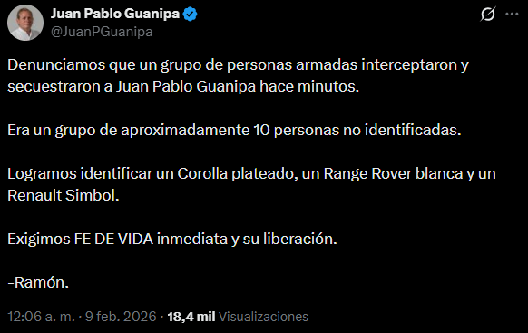 Ramón Guanipa, hijo del dirigente opositor Juan Pablo Guanipa, denunció la madrugada de este lunes 9 de febrero, a través de la cuenta oficial en X de su padre, que el político fue interceptado y secuestrado por un grupo de personas armadas, horas después de haber sido excarcelado.