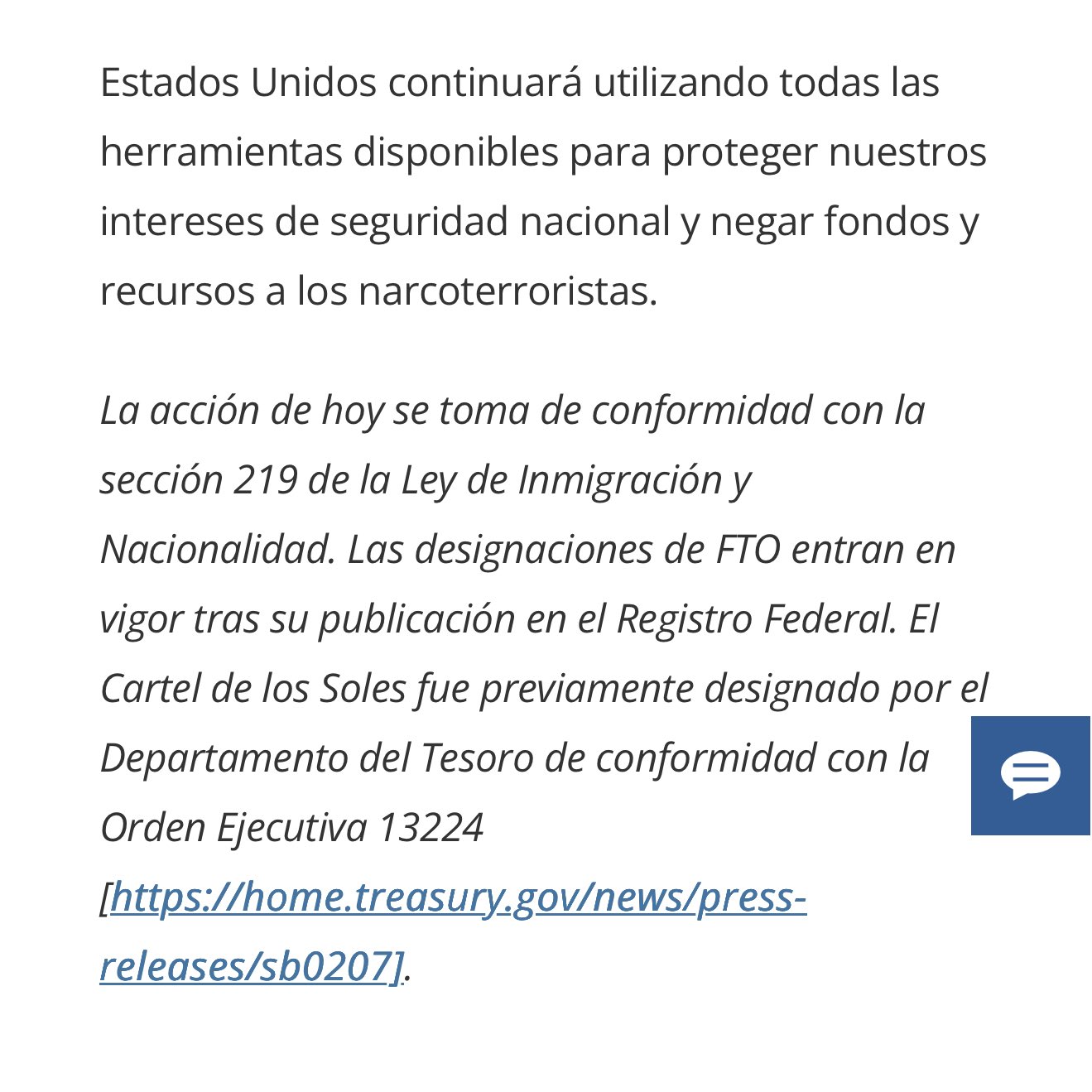La nota del alto funcionario estadounidense, señala que el Cártel de los Soles no solo participa en actividades de narcotráfico hacia Estados Unidos y Europa, sino que también es responsable de “actos de violencia terrorista” en colaboración con otras OTE ya designadas.