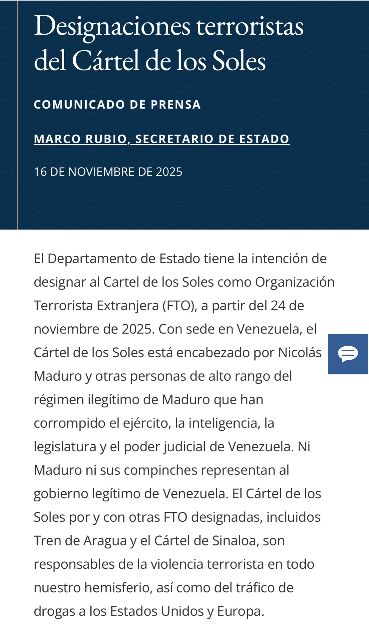 El secretario de Estado de EE.?UU., Marco Rubio, publicó en su cuenta oficial de X la intención del Departamento de Estado de designar al Cártel de los Soles, vinculado al régimen de Nicolás Maduro, como Organización Terrorista Extranjera (OTE).
