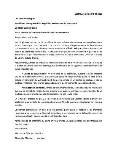 Los familiares del dirigente social y ex concejal trujillano Alfredo Márquez emitieron una carta al régimen chavista donde solicitan su excarcelación luego de ser detenido el pasado lunes 12 de enero por funcionarios de la Policía Nacional.
