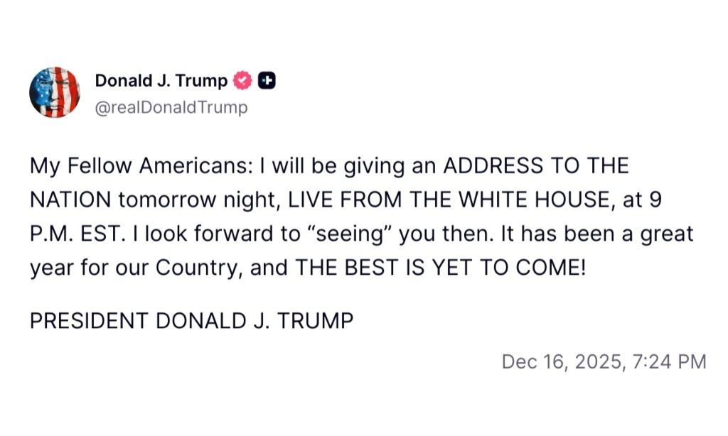 En su publicación, el jefe de Estado especificó que la alocución tendrá lugar a las 9:00 p.m., hora del este. El anuncio generó expectativa inmediata sobre los temas que abordará el líder republicano en este horario estelar.