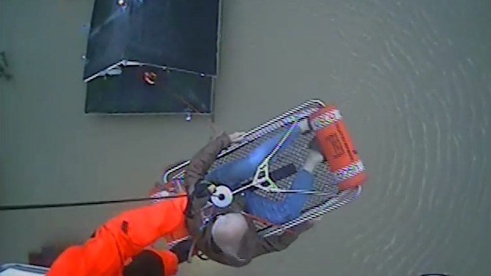 Un video proporcionado por la Guardia Costera mostró a los rescatistas evacuando por aire a dos personas atrapadas en una casa sumergida. La Guardia Costera informó que los sobrevivientes fueron trasladados a una zona de aterrizaje cercana para recibir atención médica.